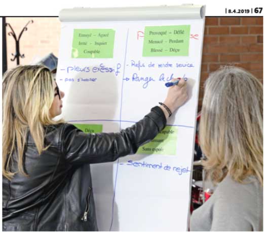 On a aussi vu quelles étaient les difficultés affrontées au quotidien, comme le non respect verbal et non verbal, l’opposition, les disputes dans la fratrie ou encore un esprit de compétition.» Les réactions ne se font pas attendre: «Oh oui, le non-respect, c’est fréquent, ces temps!», soupire Sandra, maman de deux garçons de 10et 13 ans, en se carrant dans sa chaise. Pour permettre aux participantes de faire connaissance, leur professeure commence par leur demander de raconter chacune quatre anecdotes personnelles, dont une doit être fausse. Aux autres de deviner de laquelle il s’agit. On apprend ainsi que Lisbeth a quatre enfants et quinze petits enfants et qu’elle est maman d’accueil de trois jeunes l’estime de soi ou sa capacité à exprimer ses émotions.